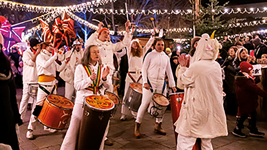 Kraftvolle perkussive Musik als Fundament für einen erdigen Sound. Das 10 bis 20-köpfige Ensemble bringt Publikum und Marktplatz zum Tanzen.